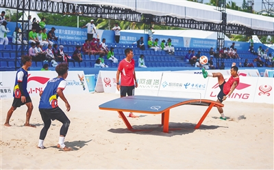 4月26日,三亚亚沙会台克球男双比赛开打。中国队队员飞身扣球。海报集团全媒体中心记者 陈元才 摄